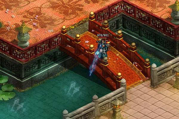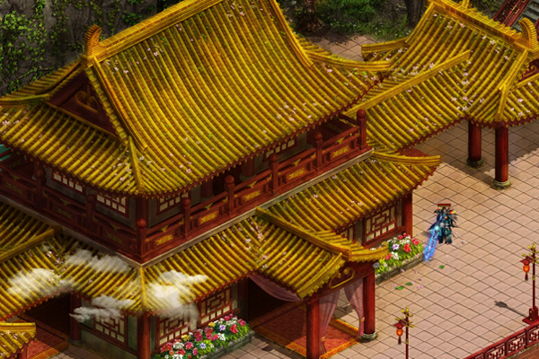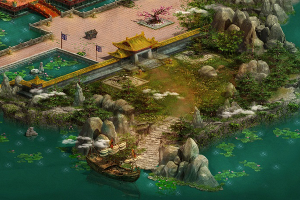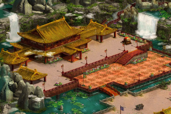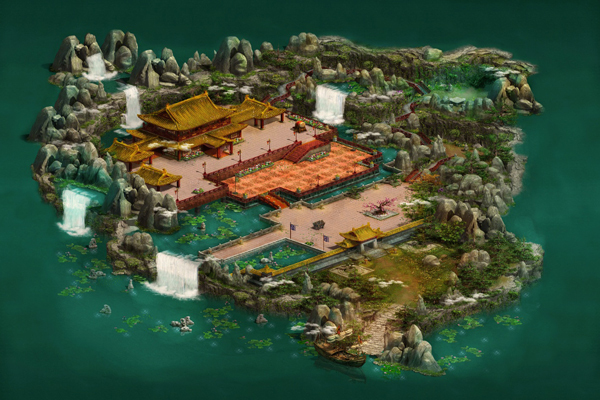 群山环绕中间,有一座金黄色大殿,雄伟气魄,四周有很多偏殿。群山周围很多瀑布,广场周围有一处小池塘,里面养着很多灵鱼,大门外是一座小码头,每天有船只来往。