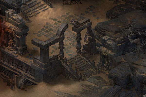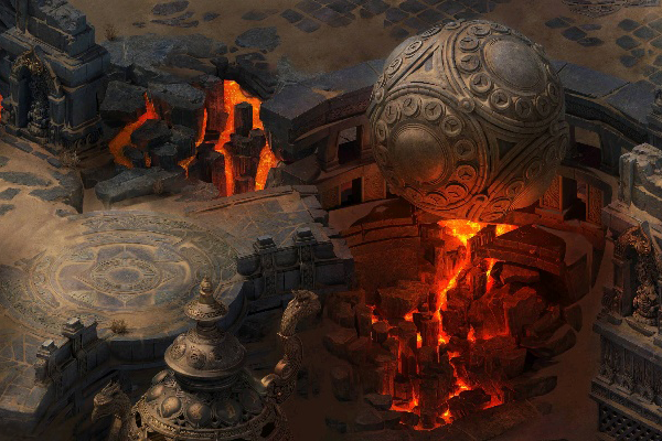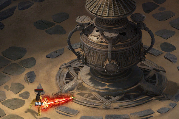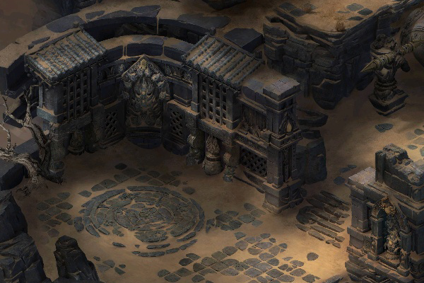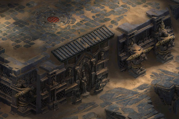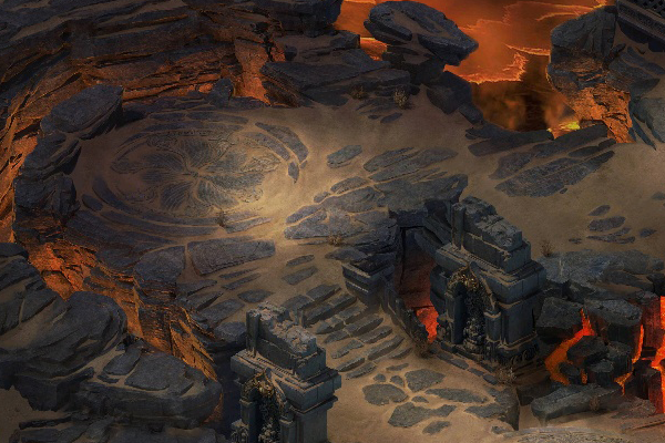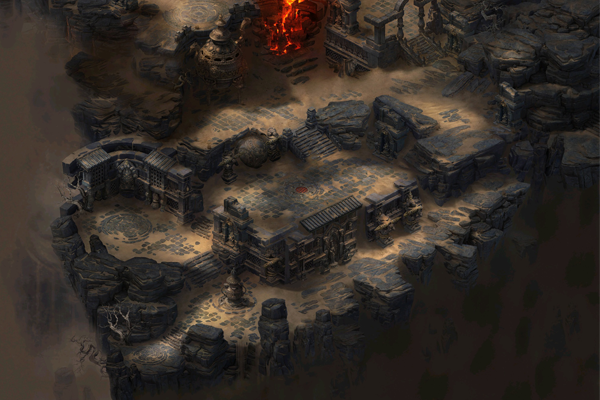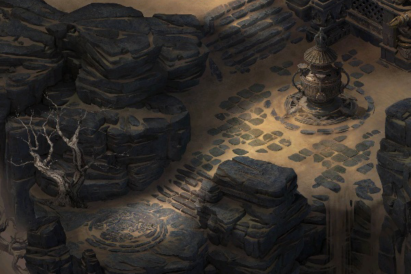 火焰山山脚还未真正进入火焰山领域,只有干涸开裂的大地,枯死的老树,枯黄的草。炎奴在这里搭建了简易破烂的棚子和简陋的祭坛作为他们进山前的休息所。不断有燃烧着的怪物从山上跑下来。