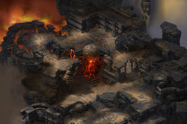 山腰处充斥着红色的火焰,道路交错,怪石嶙峋,各种炎枭山鬼漫步其中。