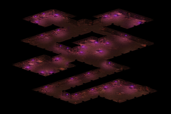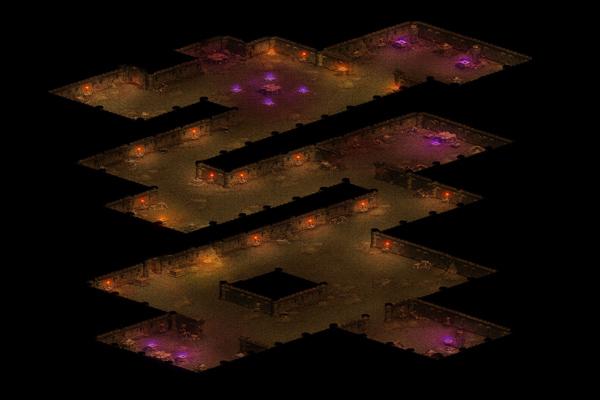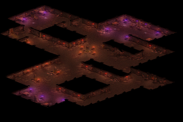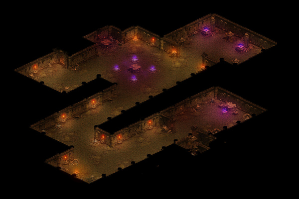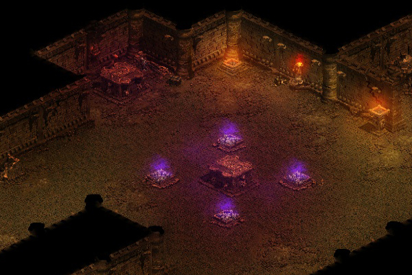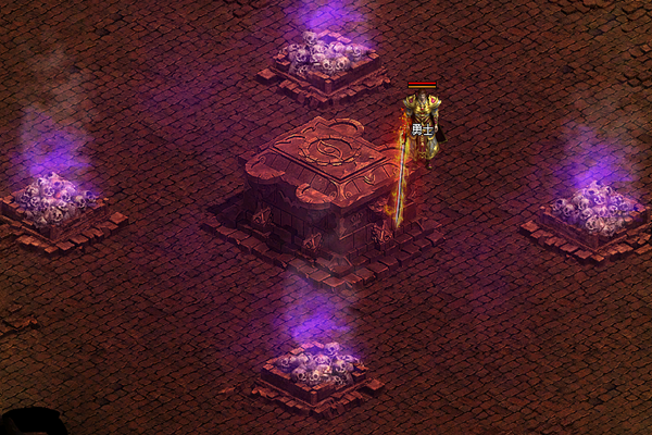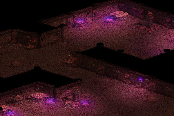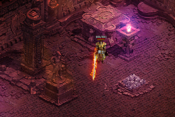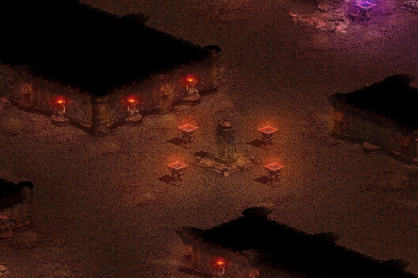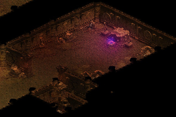 这是一个宏伟的大厅,地板中间有一条黑红色的道路,似乎是用鲜血浇灌的。道路的尽头是一个祭台。大厅的正中有两个石头柱,石柱上挂着恶魔的画像。