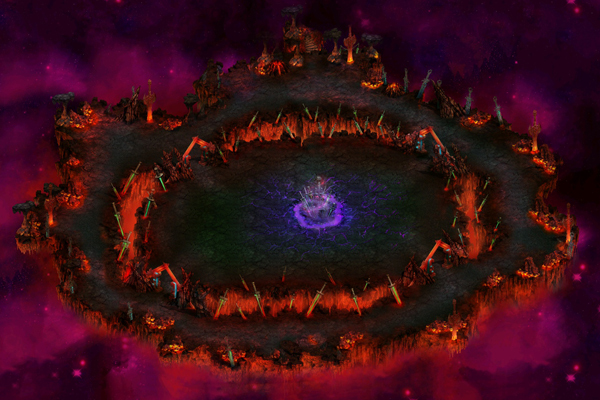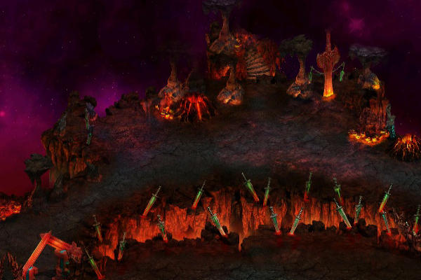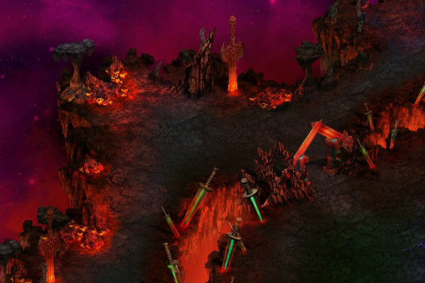 万剑之眼战场由两块漂浮的陆地组成,人族和恶魔各占一块陆地,两块陆地之间仅靠三座石桥连接。