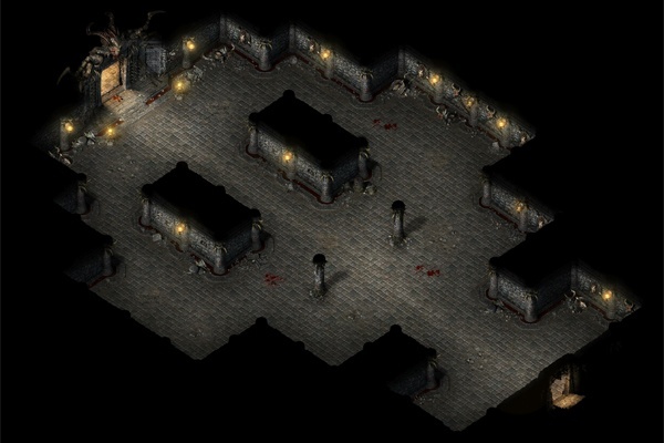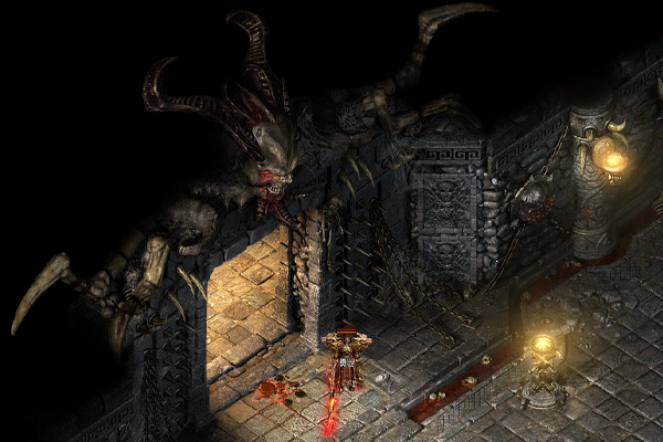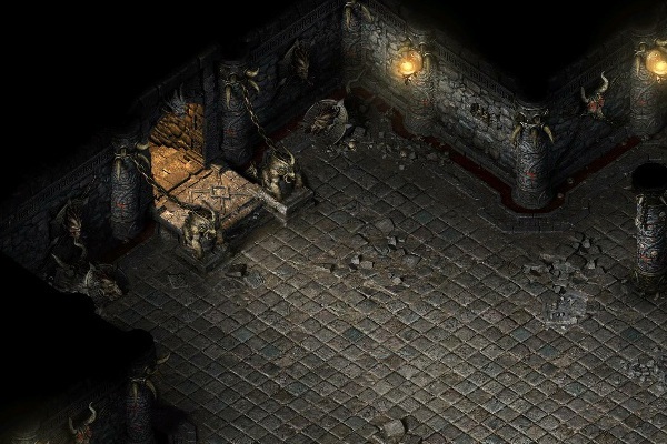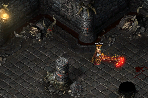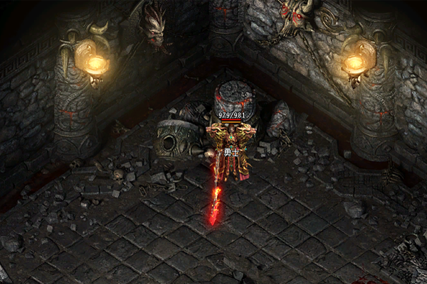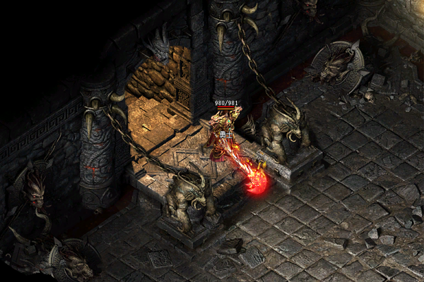 门口有两只金色镇魔神兽,墙壁上挂有当年诛杀的魔物首级,柱子亦有魔牙装饰,角落散布着不少骷髅和魔首。