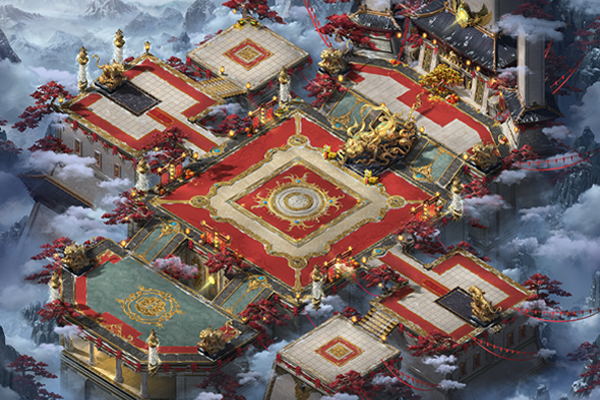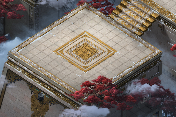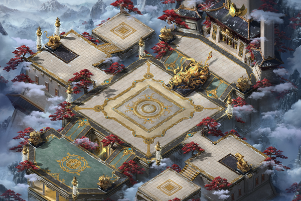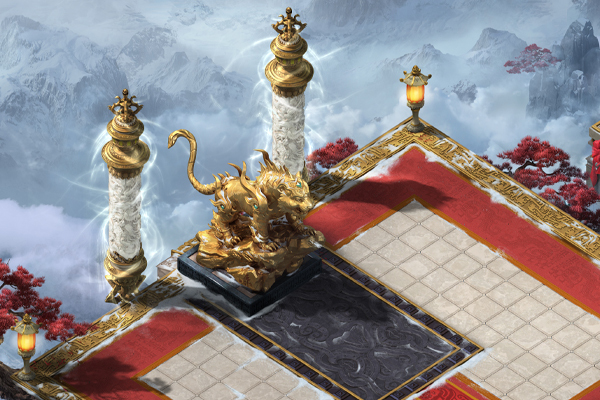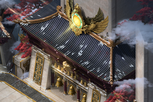 主殿由多处平台相连构成,平台外围生长着罕见的红松,于庄严中增添些许明媚。位于中央的主平台上立有黄金打造的巨大白虎雕像,其额前带烈焰印记,足踏祥云,大张虎口,蓄势待发,气势骇人。六座相对小型的白虎雕像呈守护姿态分立于前后、左右相连的平台上,震慑四方。