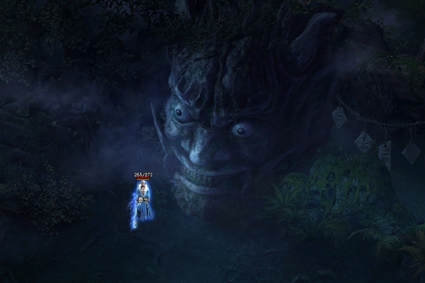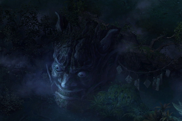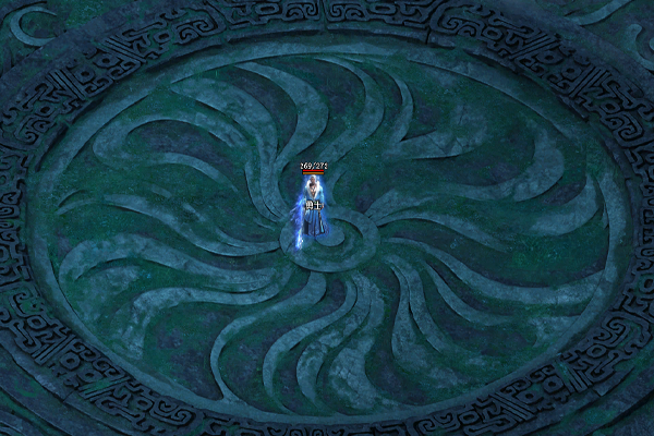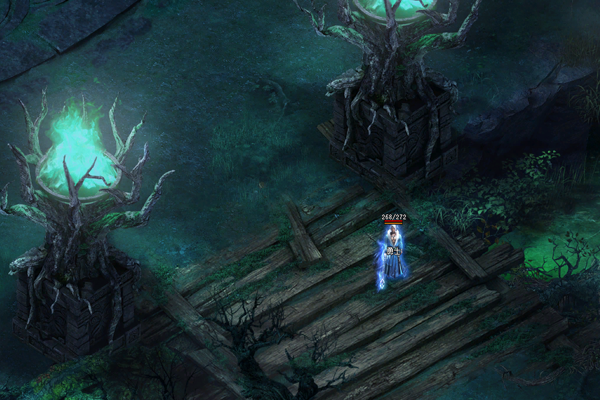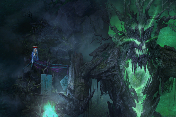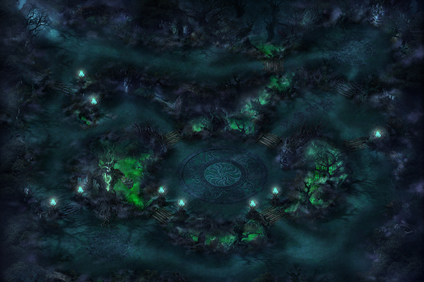 魔雾林常年处于浓雾之中,林中光线昏暗,其间散落着多个形状不规则的小水潭,潭水散发着莹莹绿光,透着诡异的气息。几颗璀璨夺目的夜明珠,置于台阶附近用以照明。