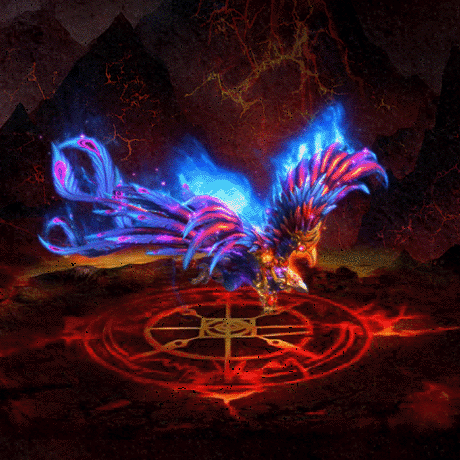 孔雀大明王真身是一种巨大的神鸟,其形似鹰,鸣声如凤,头部像鹰,钩状鸟嘴,金色的鸟头,翅膀根部有黄金铠甲,翅膀五彩斑斓,尾巴有一个个眼睛状纹路。全身羽毛呈现红蓝紫过渡的颜色。
