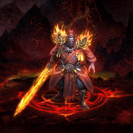 钟馗豹头红眼,铁面虬鬓,左右肩膀有两豹头呈咬持状,脖子带一串黑曜石项链,身着圣赐红色衣袍,衣摆随风摇曳,繁琐花纹绣于衣袍上,左右胸前均有符咒,腰间佩戴铜制腰带,手持火焰宝剑。