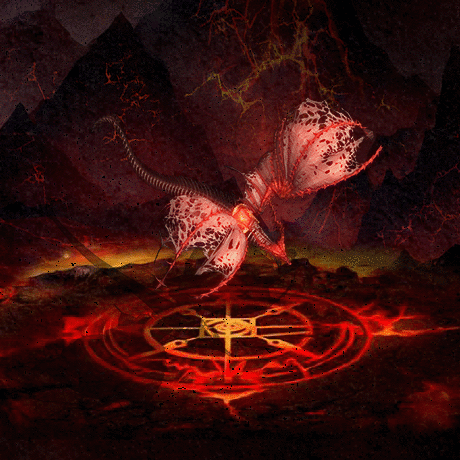 嗜血红龙通体骨骼呈现红色,全身没有皮肉存在,除了蛛网状翅膀外,全是红色骨骼。尾部为三叉形,从胸腔到尾巴都是空腔骨骼。赤红色龙头瘦长,有两个荆棘状龙角,炽热的火焰存在于龙腔之中。