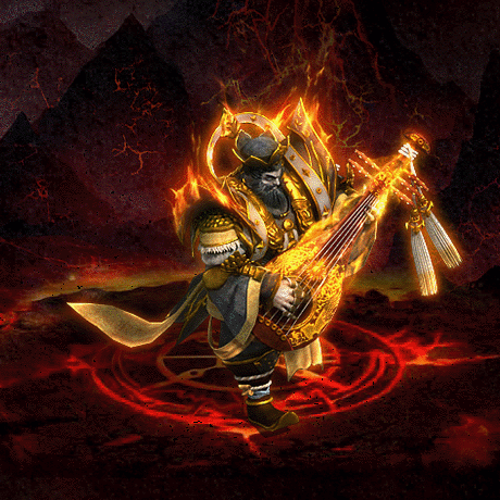 魔礼海头戴莲花冠,身穿黄色鎏金甲胄,手持碧玉琵琶,上有四条弦,按“地、水、火、风”排列,拨动弦声,风火齐至,琵琶上佩戴两个坠饰,随风微微摇曳。