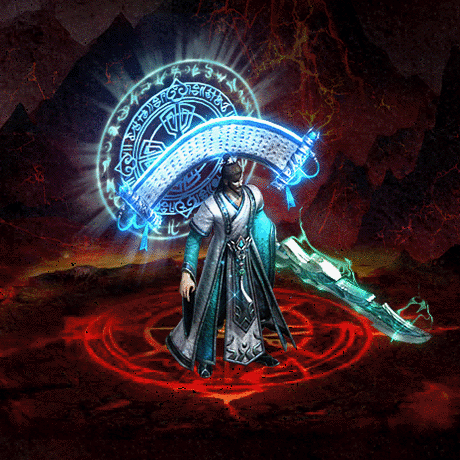 玉鼎真人身材高大,梳着黑色发髻,身穿仙家宝贝八卦绶衣,刨袖宽大,主色调为绿色和白色。腰部有蓝绿色宝石装饰,下垂丝绦。背后为阐教密箓卷轴,卷轴张开,其上有天书文字,背后有家秘纹特效。