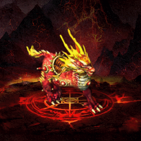 猰貐头尾似龙,身似虎,头部长有龙角和长长的金色龙须,形态大致形如麒麟,遍体通红,背部背着可供人乘坐的鞍具。
