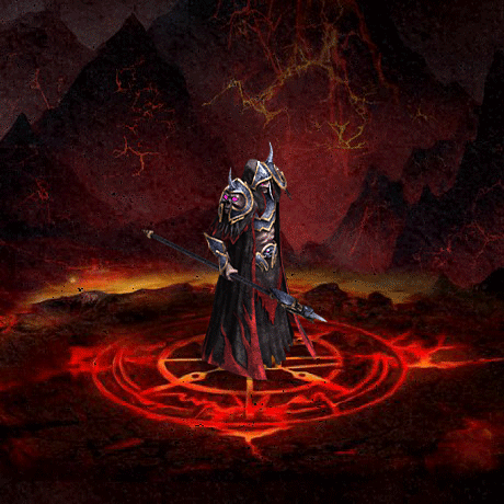 泛紫的皮肤,红色眼睛,耳朵戴着一对白色的、长长的耳环,头戴头盔,身上穿着紫红色华丽的长袍铠甲,手持一柄长矛法杖。
