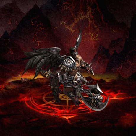 半人马全身皮肤黝黑,一身健硕的肌肉,高高扎起的黑色头发,愤怒的面孔,耳朵尖尖,牙齿呲出。身穿野蛮人一样的银黑色的铠甲,后背长着一对黑色的双翅,手持一长柄巨斧,十分好战。