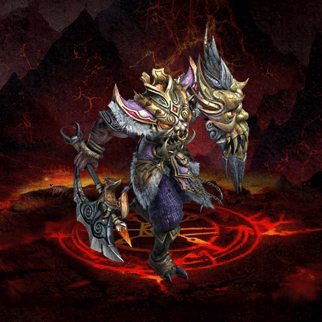 刑天身材健硕,是一个体型巨大的无头上古巨人,以双乳为眼,肚脐为口。身穿紫金盔甲与虎皮,腰挂骷髅装饰,右手持巨斧,左手拿凶狠的怪物盾牌,有两个巨大的脚趾。