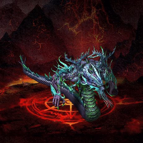 巨大无比的蛇形身躯,紫色鱼鳞般的皮肤,腹部蛇皮样条纹,蜥蜴般长尾巴,带有蓝色尖刺。头部像鳄鱼一样瘦长且长有须,头上一对长长的鹿角,上身还长有双臂,末端双手带有长长的爪子。